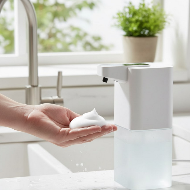 Dieser automatische Seifenspender macht das Händewaschen mühelos. Der Infrarotsensor gibt die perfekte Schaummenge kontaktlos ab, und das USB-wiederaufladbare Design sorgt für lange Nutzung.